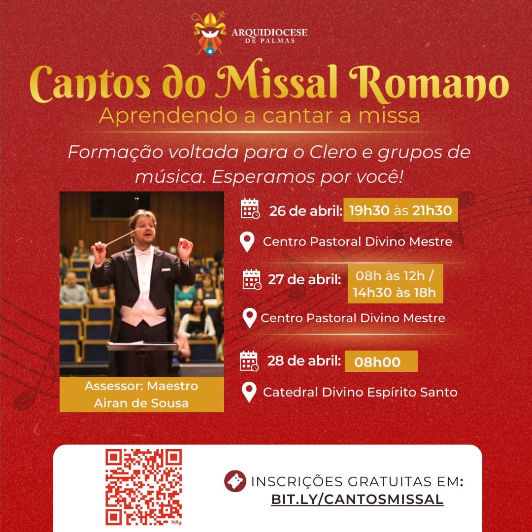 A Arquidiocese de Palmas está promovendo a formação com o tema:, nos dias 26 a 28 de abril. O conteúdo é voltado para o Clero e os leigos que são voluntários nos grupos de música das paróquias com o objetivo de formar a melhor maneira de cantar a Santa Missa, de acordo com o novo Missal. Toda a formação será assessorada pelo Maestro Airan de Sousa, vindo de Brasília (DF). Serão dois dias de formação, 26 e 27, e um dia de prática durante a Santa Missa celebrada no dia 28 de abril na Catedral Divino Espírito Santo. As inscrições são gratuitas e já estão abertas pelo link: .
